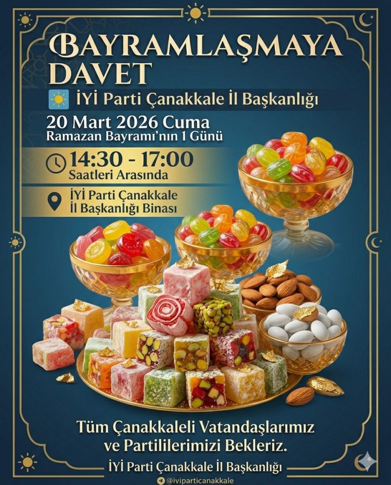 Ramazan Bayramı dolayısıyla İYİ Parti Çanakkale İl Başkanlığı tarafından bayramlaşma programı düzenleniyor. Çanakkale halkını ve parti mensuplarını bir araya getirecek olan program, bayramın manevi atmosferini paylaşmak amacıyla 20 Mart 2026 Cuma günü (yarın) gerçekleştirilecek. Ramazan Bayramı’nın birinci gününe denk gelen etkinlik, 14:30 ile 17:00 saatleri arasında İYİ Parti Çanakkale İl Başkanlığı binasında düzenlenecek.