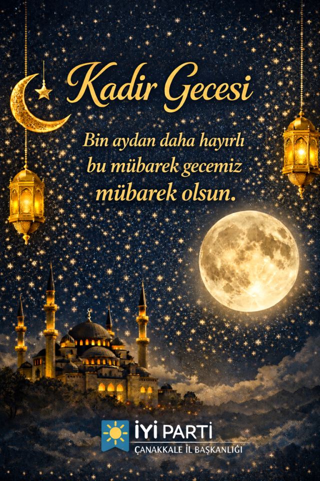"İYİ Parti Çanakkale İl Başkanlığı olarak, bin aydan daha hayırlı olduğu müjdelenen mübarek Kadir Gecesi’ne ulaşmanın huzur ve mutluluğunu yaşıyoruz. Bu müstesna gecenin başta aziz milletimiz olmak üzere tüm İslam âlemine hayırlar getirmesini temenni ediyoruz.