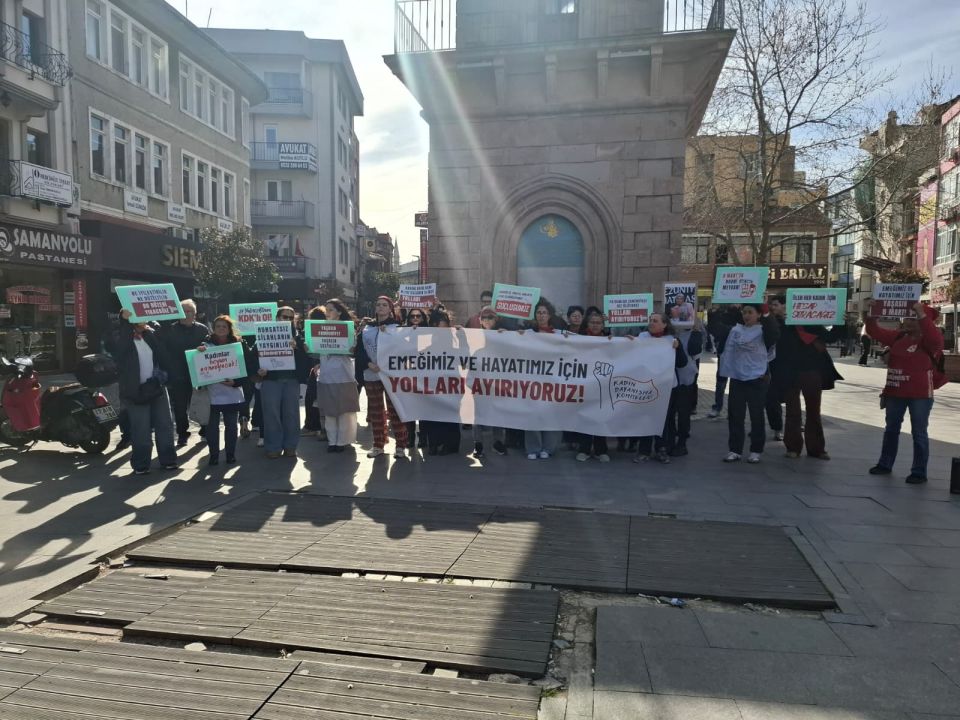 “Esas çağrımız ise yolları ayırmak. Kadınlar kiminle yolları ayıracak ve ayırmak zorunda? Her 8 Mart’ta süslü püslü reklamlarıyla, bugüne özel indirimleriyle boy gösteren ama o pırıltılarının arkasındaki emek sömürüsüyle, mobbingle, tacizle bu düzenin sürmesini