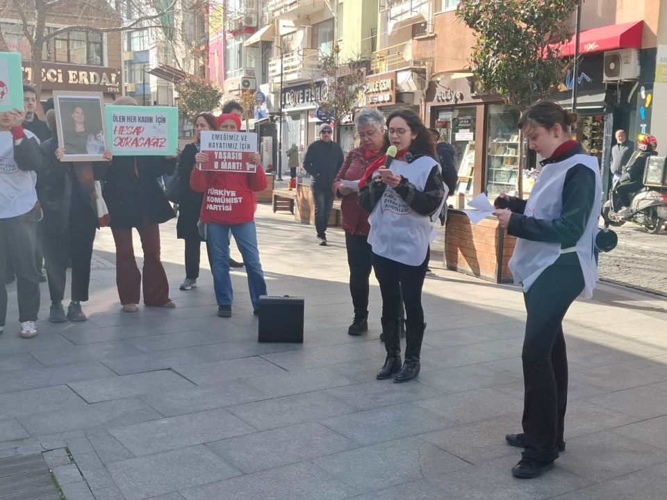 “Bugün 8 Mart Dünya Emekçi Kadınlar günü, bizim günümüz. Bugün sizleri mesai yapmak zorunda olduğu için; hasta, yaşlı ve çocuk bakımı sırtına yüklendiğinden evden çıkamadığı için, yaşamak istiyorum çığlıklarına rağmen sesi duyulmayıp yaşamdan koparıldığı için burada olamayan tüm kardeşlerimiz adına da selamlıyoruz. Onların bize verdiği mücadele gücünü tüm kalbimizde hissediyoruz.”