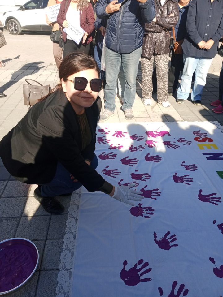 kadınlar mor boya ile el izlerini bastılar. Yürüyüşte, kadınların