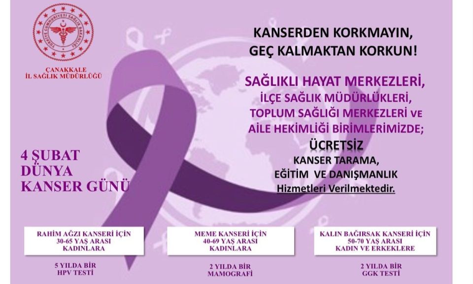 Dünya Kanser Günü kapsamında İl Sağlık Müdürlüğü ve ilgili sivil toplum kuruluşları, sosyal medya hesaplarından vatandaşları tarama programlarına davet etti. 2026 yılı teması olan "Kanser Bakımında Daha İleriye" vizyonuyla, her bireyin sağlık hizmetlerine eşit erişimi vurgulandı.
