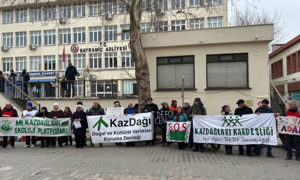 Kazdağları Ekoloji Platformu’nun (KEP) çağrısıyla Çanakkale ve Körfez bölgesinden gelen çok sayıda vatandaş ve çevreci, Bayramiç Adliyesi önünde bir araya geldi. Hacıbekirli köylü kadınların açtığı "İşletme Ruhsatı İptal Davası"na müdahillik talebinde bulunan grup, projeyeki usulsüzlükleri içeren kapsamlı bir suç duyurusu dosyasını savcılığa sundu.