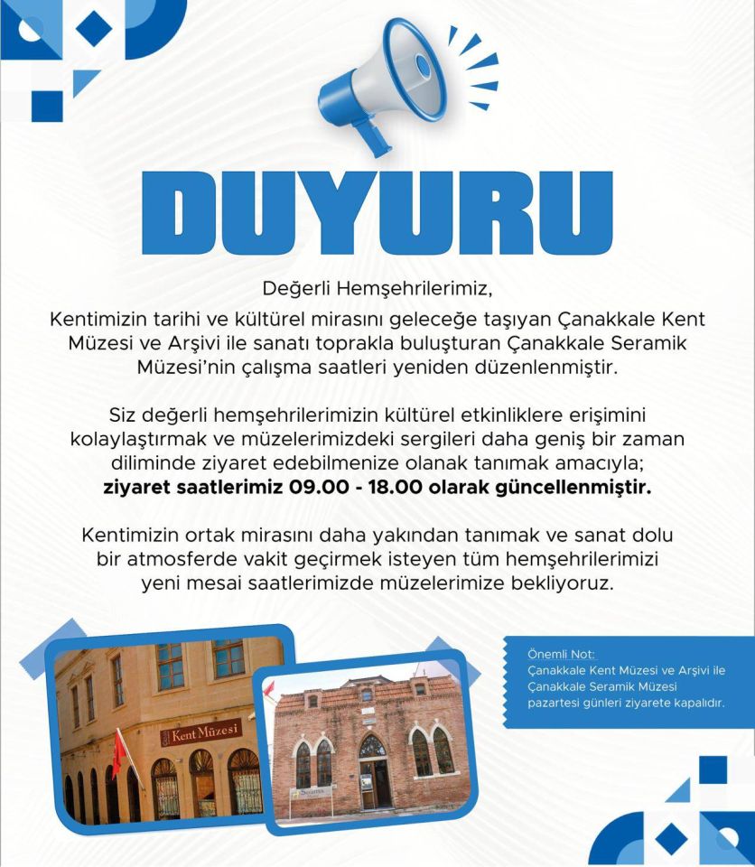 Belediyeden yapılan duyuruda ayrıca Çanakkale Kent Müzesi ve Arşivi ile Çanakkale Seramik Müzesi pazartesi günleri ziyarete kapalı olduğu bilgisi de paylaşıldı.