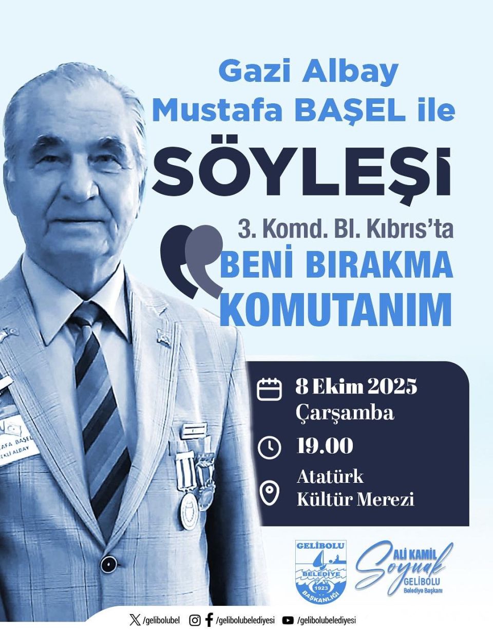 Gelibolu, unutulmaz bir kahramanlık hikâyesine tanıklık etmeye hazırlanıyor. Kıbrıs Barış Harekâtı’nda görev yapan Gazi Albay Mustafa Başel, yaşadıklarını ve vatan uğruna verilen mücadeleyi “3. Komd. Bl. Kıbrıs’ta ‘Beni Bırakma Komutanım’” adlı söyleşisinde paylaşacak.