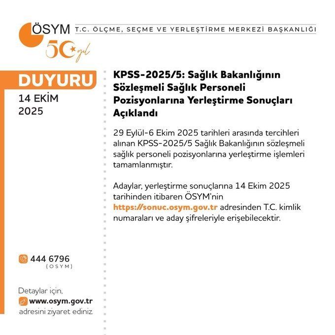 "KPSS-2025/5: Sağlık Bakanlığının Sözleşmeli Sağlık Personeli Pozisyonlarına Yerleştirme Sonuçları Açıklandı. 29 Eylül-6 Ekim 2025 tarihleri arasında tercihleri alınan KPSS-2025/5 Sağlık Bakanlığı’nın sözleşmeli sağlık personeli pozisyonlarına yerleştirme işlemleri tamamlanmıştır. Adaylar, yerleştirme sonuçlarına 14 Ekim 2025 tarihinde saat 15.00'ten itibaren ÖSYM’nin https://sonuc.osym.gov.tr adresinden T.C. kimlik numaraları ve aday şifreleriyle erişebilecektir. Yerleştirme sonuçlarına ilişkin sayısal bilgiler Ek'te sunulmuştur"