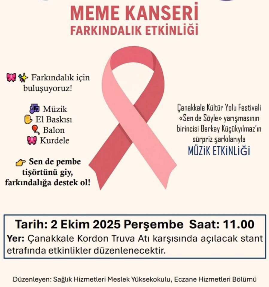 ÇOMÜ Sağlık Hizmetleri Meslek Yüksekokulu Eczane Hizmetleri Bölümü tarafından meme kanserine yönelik farkındalık oluşturmak amacıyla 2 Ekim 2025 Perşembe günü saat 11:00'de Kordonboyundaki Truva Atı karşısında stant açılacak.