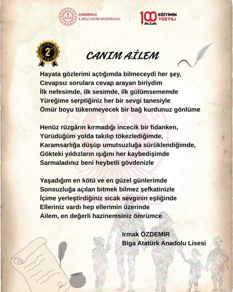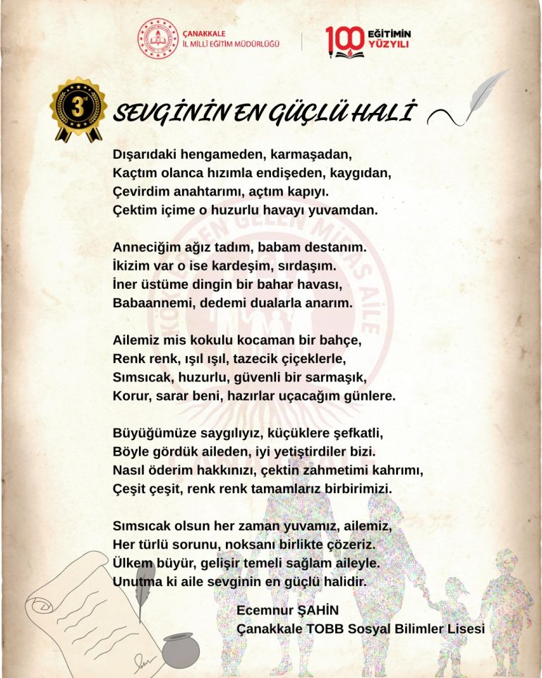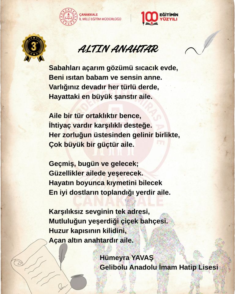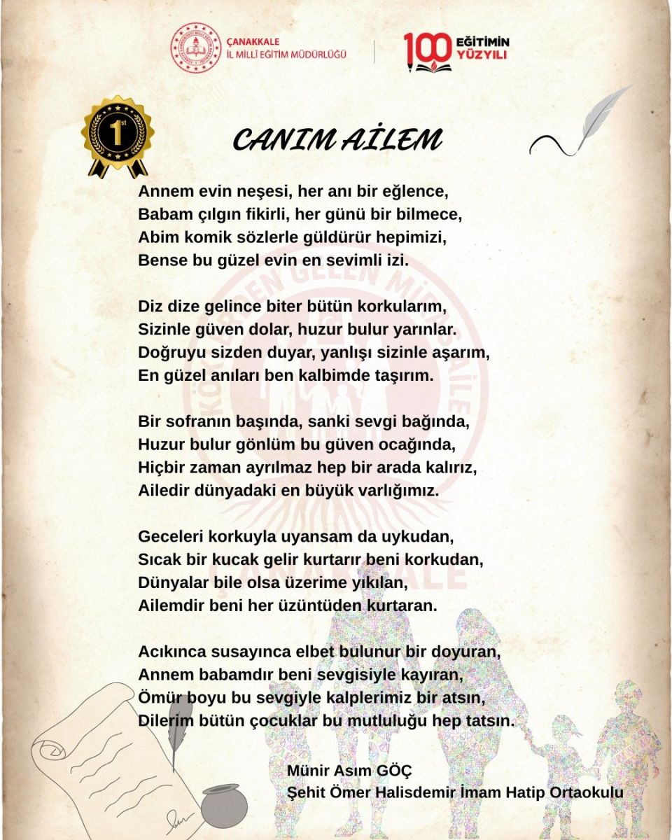 Çanakkale İl Milli Eğitim Müdürlüğü tarafından yürütülen “Köklerden Gelen Miras: Aile” Projesi kapsamında düzenlenen “Mısralarda Ailem” temalı şiir yarışmasının sonuçları belli oldu. Aile kavramının edebi bir dille ele alındığı yarışma, öğrencilerin yoğun ilgisiyle gerçekleştirildi.