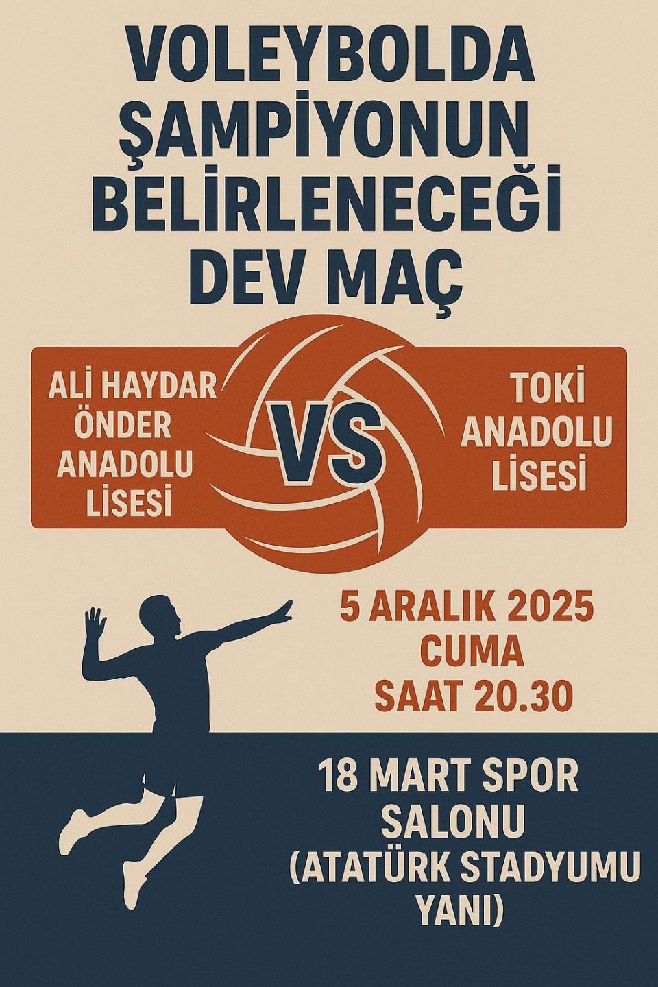 Çanakkale’de 24 Kasım Öğretmenler Günü etkinlikleri kapsamında düzenlenen voleybol turnuvasında finale yaklaşılıyor. Turnuvanın en kritik ve merakla beklenen mücadelesinde Ali Haydar Önder Anadolu Lisesi ile TOKİ Anadolu Lisesi şampiyonluk için sahaya çıkacak. Final maçı, spor severleri tek çatı altında buluşturmaya hazırlanırken, heyecan ve rekabetin zirvede yaşanması bekleniyor.