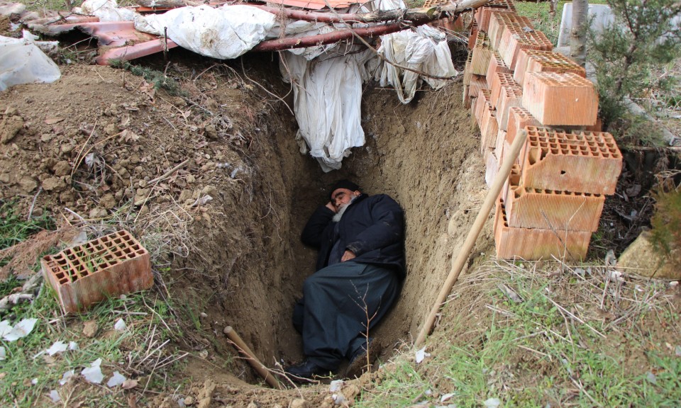 Yağışlardan etkilenmemesi için üstünü naylon ve çatı parçalarıyla kapattığı mezara gelip dua da eden 5 çocuk babası Karabela, "Kimseye zahmet vermemek için mezarımı kendim kazdım. Allah nasip ederse beni buraya defnetsinler" dedi.
