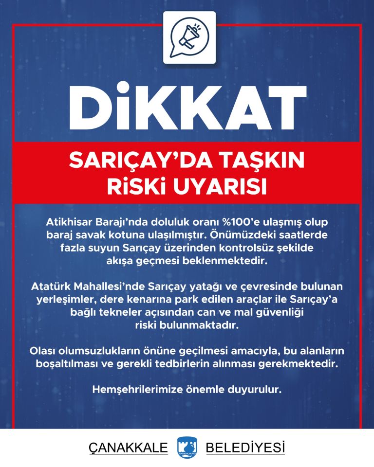 Belediye tarafından yapılan açıklamada, önümüzdeki saatlerde fazla suyun Sarıçay üzerinden kontrolsüz şekilde akışa geçmesinin beklendiği belirtildi. Özellikle dere yatağına yakın bölgelerde bulunan yerleşim yerleri, park halindeki araçlar ve Sarıçay’a bağlı tekneler için can ve mal güvenliği riski oluşabileceği ifade edildi.