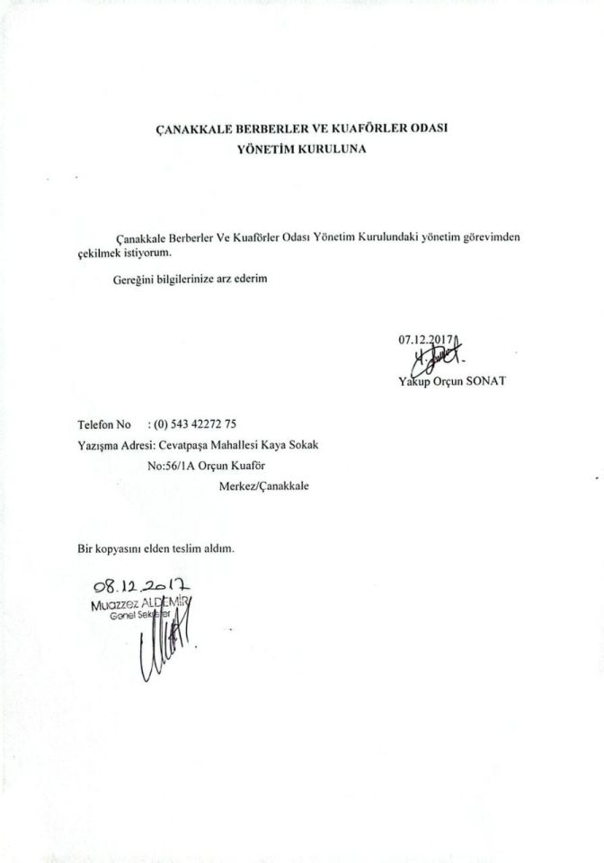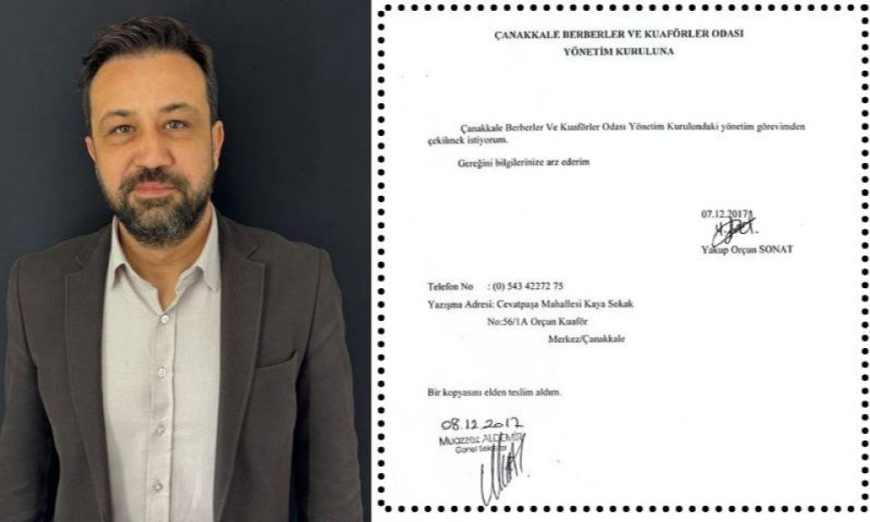 Ben, Çanakkale Berberler ve Kuaförler Odası Yönetim Kurulu üyeliği görevimden kendi irademle istifa ettim. Sayın Engin’in birlikte yürüttüğümüz yoğun çalışma sonucunda seçim kazanarak göreve geldiği ilk yönetim döneminde kendisiyle birlikte aynı yönetim kurulunda yer aldım ve dönem sona ermeden ekte sunduğum 08/12/2017 tarihli dilekçemle başvurarak, tamamen kendi iradem ve değerlendirmem doğrultusunda bu görevden ayrılma talebinde bulundum. Bir sonraki yönetim oluşumunda bulunmayı reddettim. Bu karar, mevcut yönetim anayışıyla görevimi sürdürmemin mümkün olmadığını düşündüğüm bir noktada, mesleki ve etik duruşum çerçevesinde aldığım bir karardır.