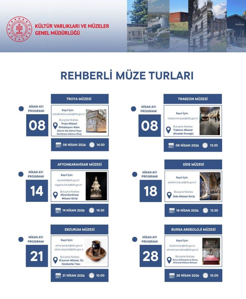 Nisan ayı için belirlenen rotada Türkiye’nin farklı bölgelerinden altı önemli müze yer alıyor: Afyonkarahisar Müzesi, Bursa Arkeoloji Müzesi, Erzurum Müzesi, Side Müzesi, Trabzon Müzesi ve Troya Müzesi.