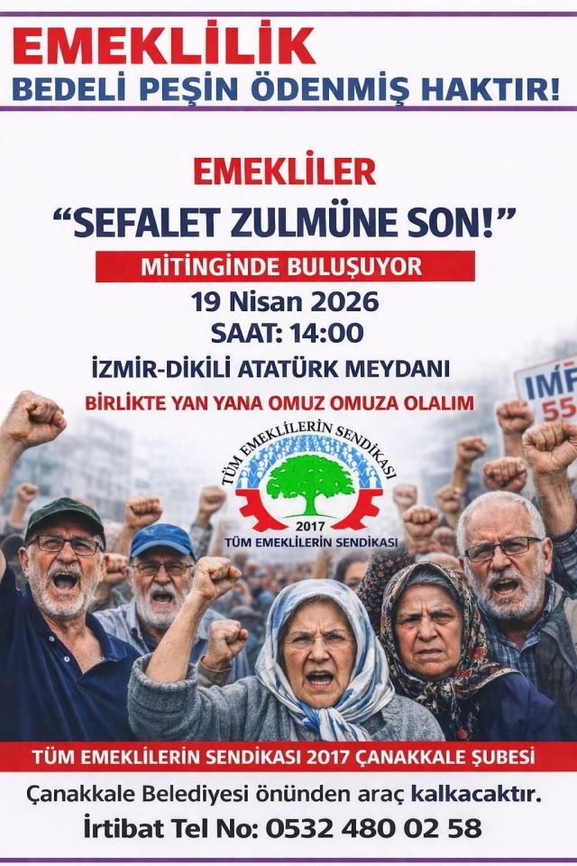 Ege Bölgesi büyük mitingimiz ise 19 Nisan'da İzmir Dikili'de gerçekleştirilecektir. Çanakkale Merkez ve tüm ilçe örgütlerimiz bu mitinge güçlü katılım sağlayacaktır. Bu haklı davamızda tüm emekli ve emekçi dostlarımızı omuz omuza, yan yana olmaya davet ediyoruz.