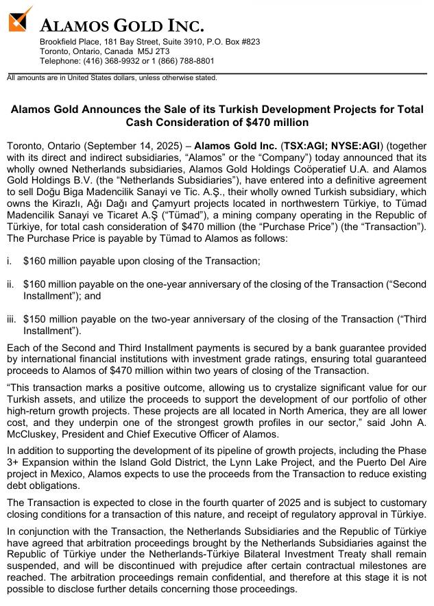 "Alamos Gold bugün, tamamına sahip olduğu Hollanda bağlı ortaklıkları Alamos Gold Holdings Coöperatief U.A. ve Alamos Gold Holdings B.V.'nin ("Hollanda Bağlı Ortaklıkları"), Türkiye'nin kuzeybatısında bulunan Kirazlı, Ağı Dağı ve Çamyurt projelerinin sahibi olan tamamına sahip olduğu Türk bağlı ortaklığı Doğu Biga Madencilik Sanayi ve Tic. A.Ş.'yi, Türkiye Cumhuriyeti'nde faaliyet gösteren bir madencilik şirketi olan Tümad Madencilik Sanayi ve Ticaret A.Ş.'ye toplam 470 milyon ABD Doları nakit satın alma bedeli karşılığında satmak için kesin bir anlaşma imzaladığını duyurdu. Satın Alma Bedeli, TÜMAD tarafından Alamos'a aşağıdaki şekilde ödenecektir: