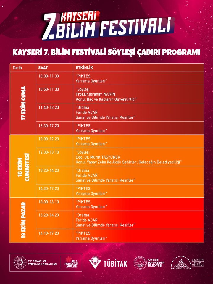 Festival süresince alanında uzman birçok bilim insanı, farklı konularda konferanslar ve söyleşiler gerçekleştirecek. Ayrıca 17 Ekim Cuma Saat 11.50’de Doç. Dr. Burcu Bakır Güngör Sağlıkta Yapay Zeka Uygulamaları, 18 Ekim Cumartesi Saat 11.40’ta Prof. Dr. Derviş Karaboğa Bal Arılarından Yapay Zekaya Yolculuk, 19 Ekim Pazar Saat 12.30’da Prof. Dr. Evren Mutlugün Nanoteknoloji Hayatımızı Nasıl Değiştiriyor, 17 Ekim Cuma Saat 12.40’ta Kaniye Altın Makro Canlılardan Mikro Canlılara Yolculuk, 18 Ekim Cumartesi Saat 12.30’da Doç. Dr. Murat Taşyürek Yapay Zeka ve Akıllı Şehirler, 17 Ekim Cuma Saat 10.50’de Prof. Dr. İbrahim Narin İlaç ve İlaçların Güvenilirliği, 17 Ekim Cuma Saat 13.30’da Ömer Çolakoğlu Kendisi Yapay, Etkisi Gerçek, 18 Ekim Cumartesi Saat 13.30’da Prof. Dr. Tuncay Dilci Dijitalin Gölgesinde Yaşam konulu söyleşiler gerçekleştirecekler.
