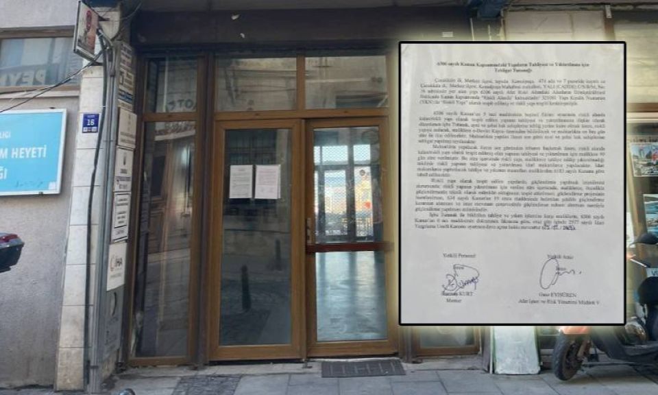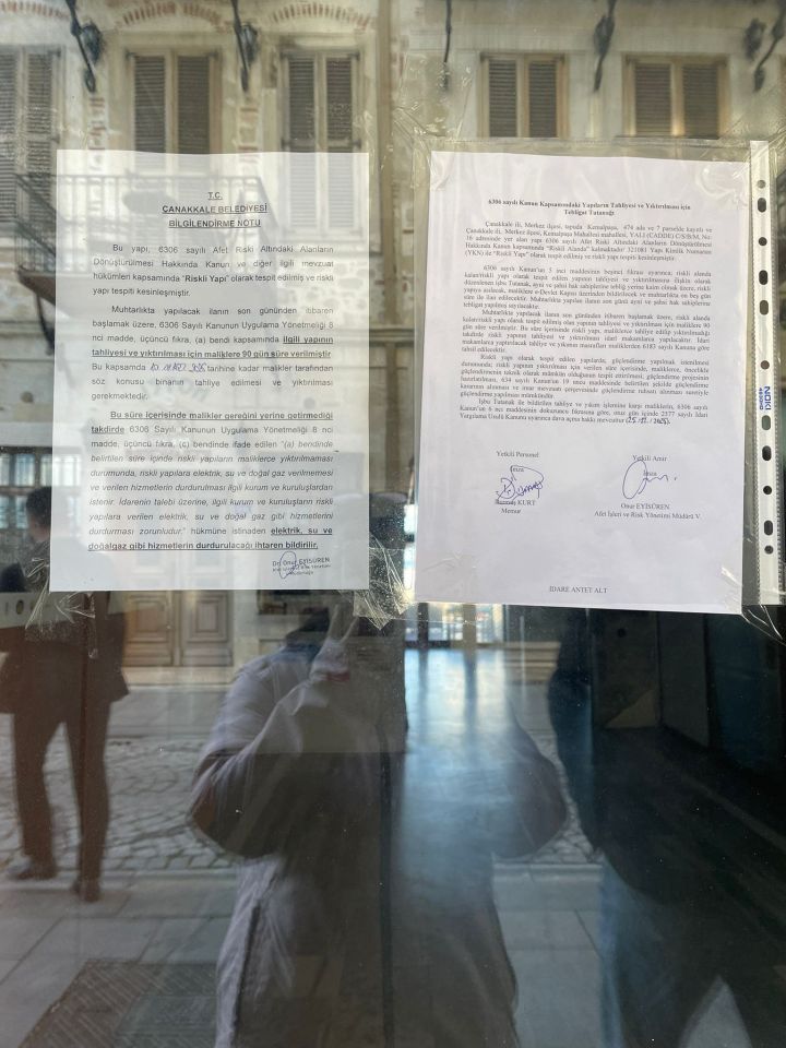 Çanakkale Belediyesi Afet İşleri ve Risk Yönetimi Müdürlüğü tarafından İşhanı girişine asılan ilk tebligatın tarihi 10 Mart 2025.