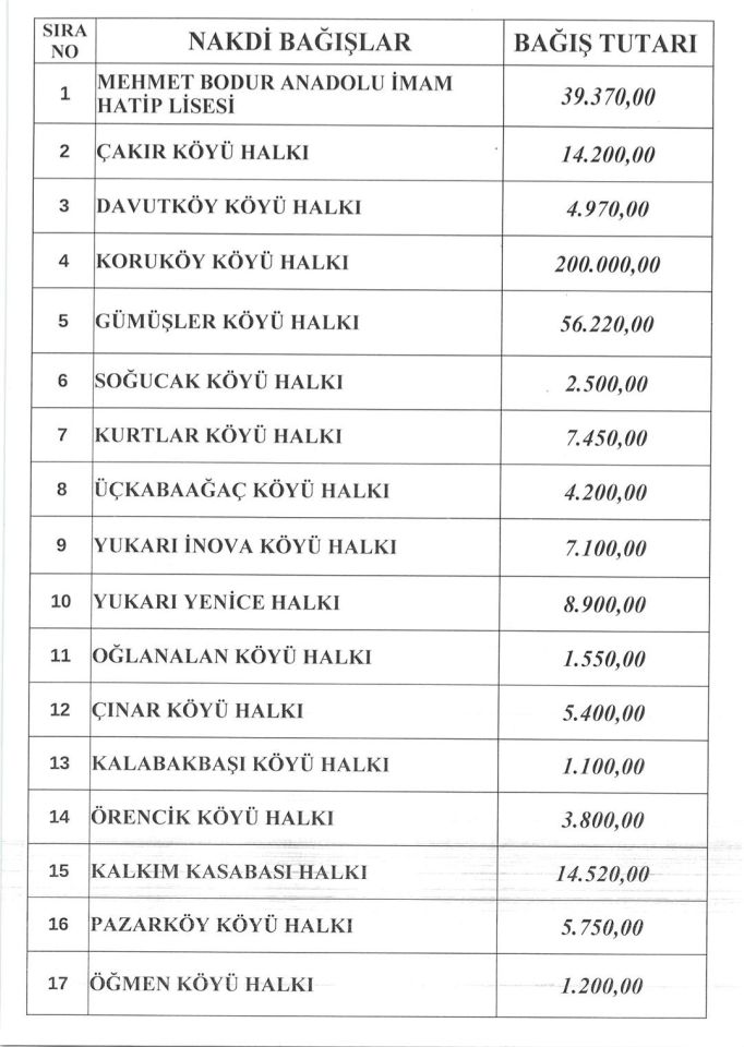 Hayır çarşısı, ayni yardımlar ile birlikte köy imamlarının öncülüğünde yapılan bağışlarla daha da güçlendi. Uzak ve yakın köylerde yapılan duyurular, imamların, müezzinlerin ve gönüllülerin çabaları sayesinde yardım çarşısına geniş katılım sağlandı.